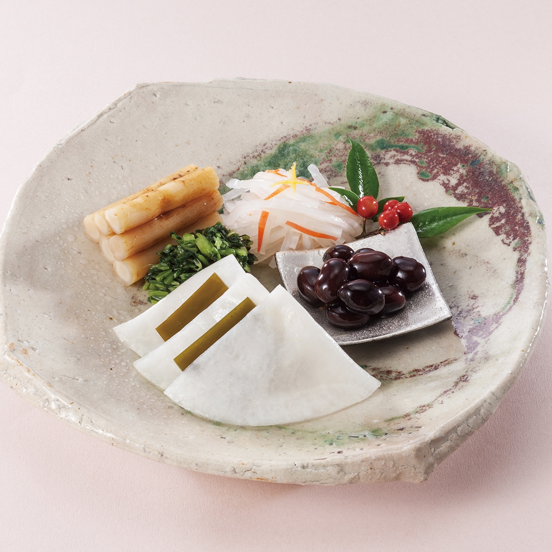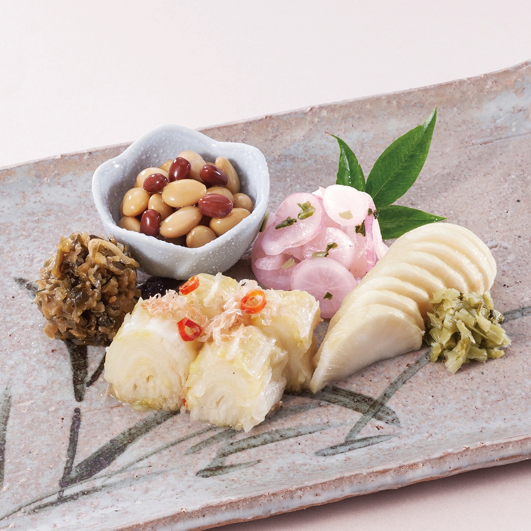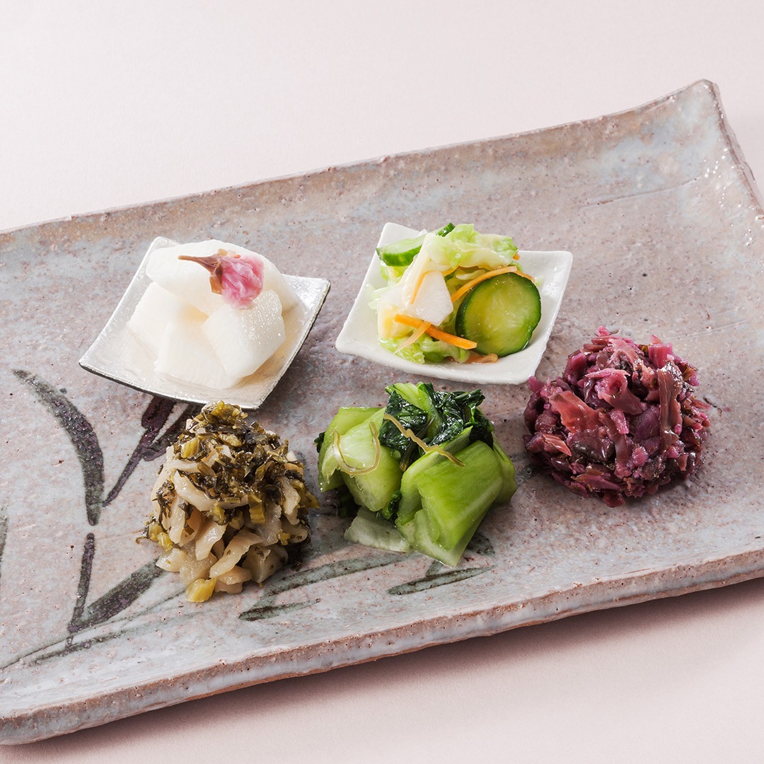 ■赤かぶら切漬・ゆず酢長いも・細ごぼう・はりはり漬・お茶漬胡瓜