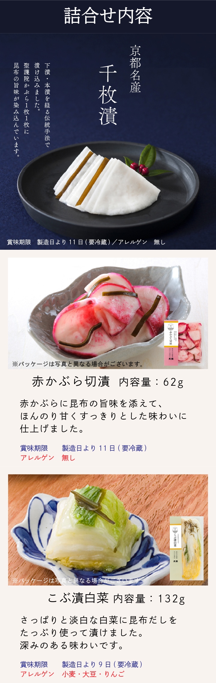 <千枚漬> 聖護院かぶら、昆布、漬け原材料[醸造酢、みりん、食塩、昆布エキス、還元水あめ、砂糖、清酒]/調味料(アミノ酸等) <赤かぶら切漬> 赤かぶら、漬け原材料[還元水あめ、食塩、醸造酢、昆布エキス、昆布]/調味料(アミノ酸等) <こぶ漬白菜>白菜、漬け原材料[還元水あめ、食塩、みりん、醸造酢、清酒、昆布エキス、りんご酢、昆布、しょうゆ、砂糖]/調味料(アミノ酸等)、(一部に小麦・大豆・りんごを含む) <壬生菜漬> 壬生菜、漬け原材料[食塩] <赤しそ胡瓜> 胡瓜、みょうが、生姜、しそ、漬け原材料[還元水あめ、りんご酢、梅酢、醸造酢、みりん、砂糖、食塩、昆布エキス]/乳酸カルシウム、野菜色素、調味料(アミノ酸等)、(一部にりんごを含む) <味すぐき>すぐき菜、漬け原材料[清酒、食塩、醸造酢、梅酢、還元水あめ、しょうゆ、みりん、砂糖]/調味料(アミノ酸)、(一部に小麦・大豆を含む) |
