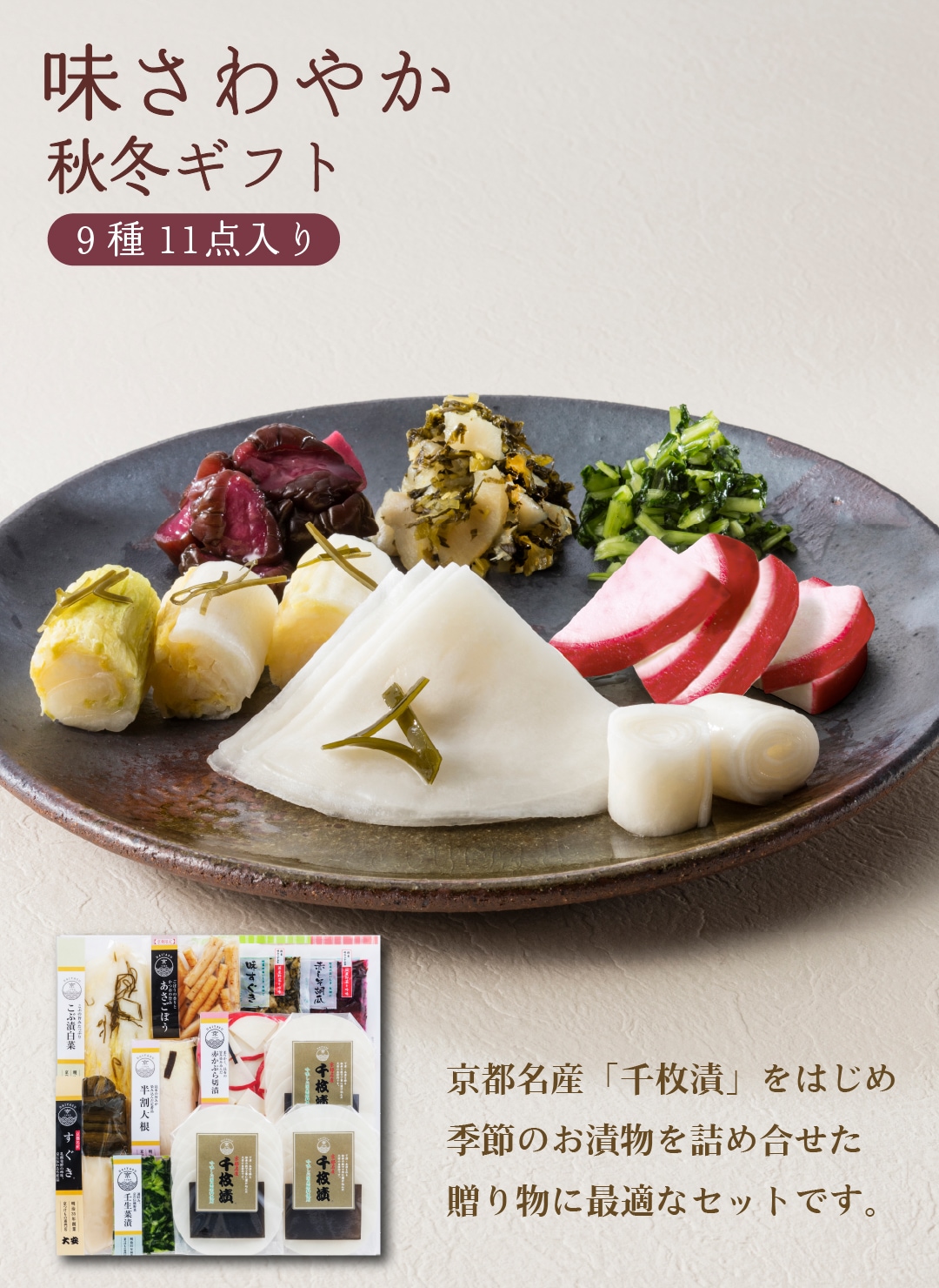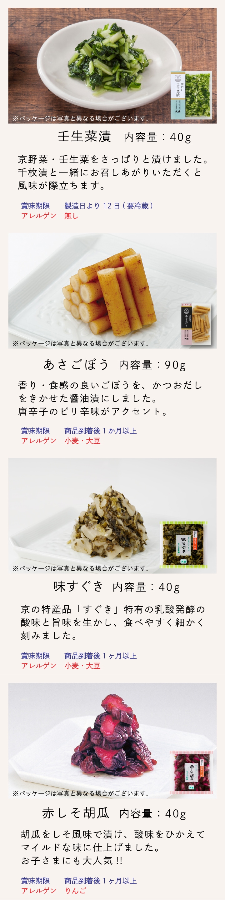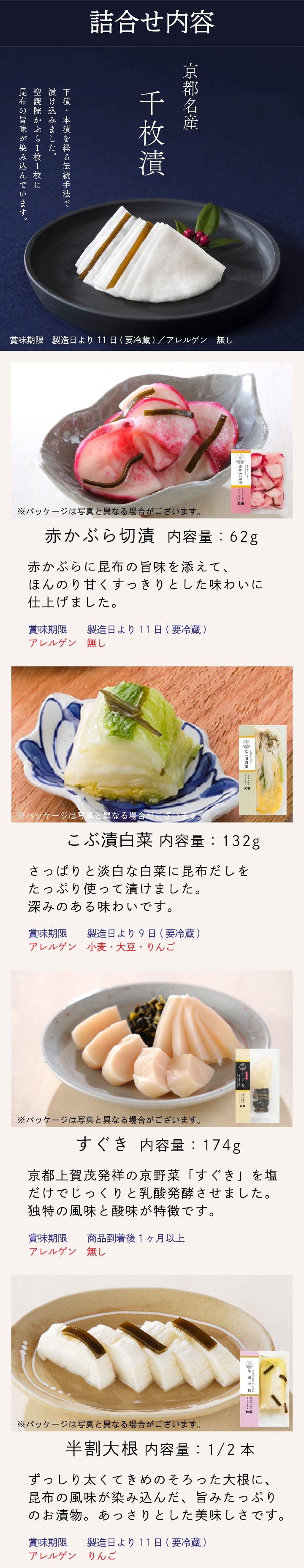 内容量 千枚漬70g×3、赤かぶら切漬62g、こぶ漬白菜132g、半割大根(1/2)1個、壬生菜漬40g、赤しそ胡瓜40g、あさごぼう90g、味すぐき40g、すぐき174g