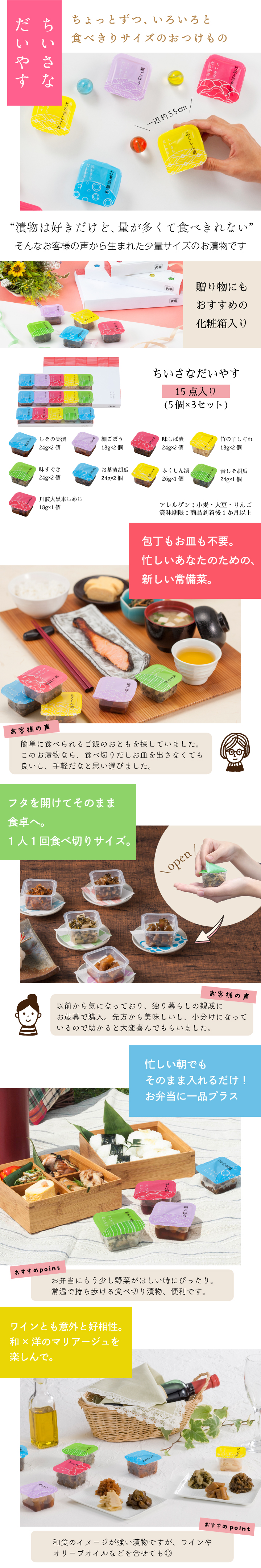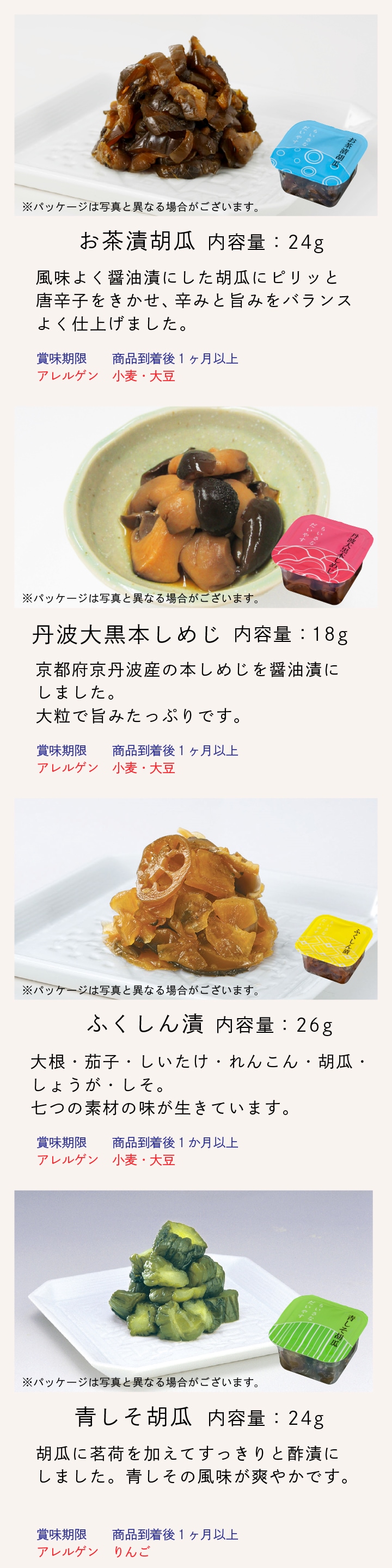 | 内容量 | 青しそ胡瓜24g、味しば漬24g×2、味すぐき24g×2、お茶漬胡瓜24g×2、しその実漬24g×2、竹の子しぐれ18g×2、丹波大黒本しめじ18g、ふくしん漬26g、細ごぼう18g×2 |