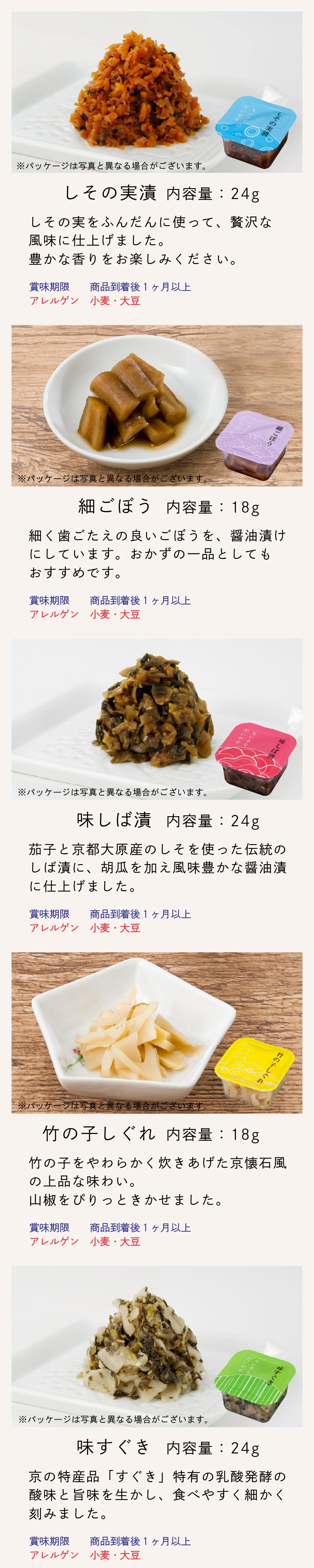 <青しそ胡瓜> 胡瓜、みょうが、生姜、しそ、漬け原材料[還元水あめ、梅酢、りんご酢、醸造酢、みりん、食塩、砂糖、昆布エキス]/調味料(アミノ酸等)、(一部にりんごを含む) <味しば漬> 胡瓜、茄子、しそ、漬け原材料[しょうゆ、みりん、醸造酢、清酒、砂糖、食塩]/調味料(アミノ酸等)、(一部に小麦・大豆を含む) <味すぐき> すぐき菜、漬け原材料[清酒、食塩、醸造酢、梅酢、還元水あめ、しょうゆ、みりん、砂糖]/調味料(アミノ酸)、(一部に小麦・大豆を含む) <お茶漬胡瓜> 胡瓜、青唐辛子、しそ、漬け原材料[しょうゆ、ぶどう糖果糖液糖、発酵調味液、食塩、醸造酢]/調味料(アミノ酸等)、酸味料、カラメル色素、(一部に小麦・大豆を含む) <しその実漬> 大根、胡瓜、しそ、しその実、生姜、漬け原材料[しょうゆ、還元水あめ、醸造酢、食塩、清酒、昆布エキス、香辛料]/調味料(アミノ酸等)、紅麹色素、クチナシ色素、(一部に小麦・大豆を含む) <竹の子しぐれ> 竹の子水煮(たけのこ(国産))、還元水あめ、しょうゆ、生姜(国産)、みりん、醸造酢、昆布エキス、山椒の実(国産)、昆布(国産)、食塩、鰹節エキス/調味料(アミノ酸等)、(一部に小麦・大豆を含む) <丹波大黒本しめじ> 本しめじ、漬け原材料[しょうゆ、還元水あめ、みりん、砂糖、鰹節エキス]/調味料(アミノ酸等)、(一部に小麦・大豆を含む) <ふくしん漬> 大根、椎茸、茄子、れんこん、胡瓜、生姜、しそ、漬け原材料[しょうゆ、砂糖、醸造酢、食塩]/調味料(アミノ酸等)、(一部に小麦・大豆を含む) <細ごぼう> ごぼう、漬け原材料[しょうゆ、糖類(砂糖・ぶどう糖果糖液糖)、発酵調味料、醸造酢、食塩]/調味料(アミノ酸等)、香辛料抽出物、カラメル色素、酸化防止剤(ビタミンC)、(一部に小麦・大豆を含む) |