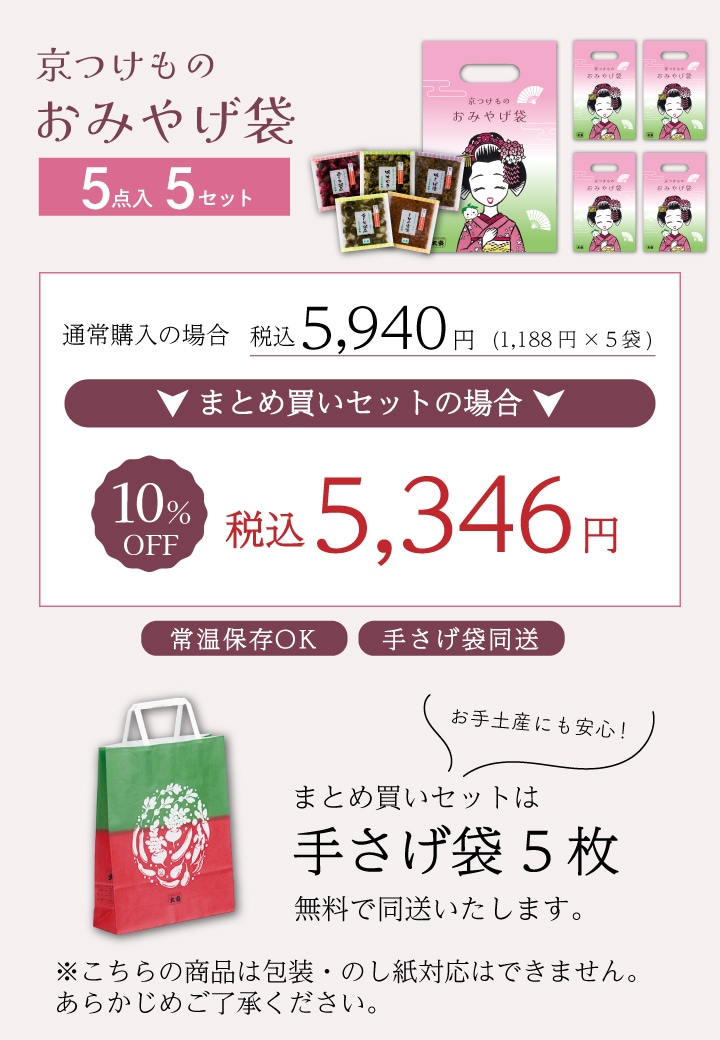| セット内容 | おみやげ袋(M-11)×5袋(青しそ胡瓜40g、赤しそ胡瓜40g、味しば漬40g、味すぐき40g、しその実漬40g) |
