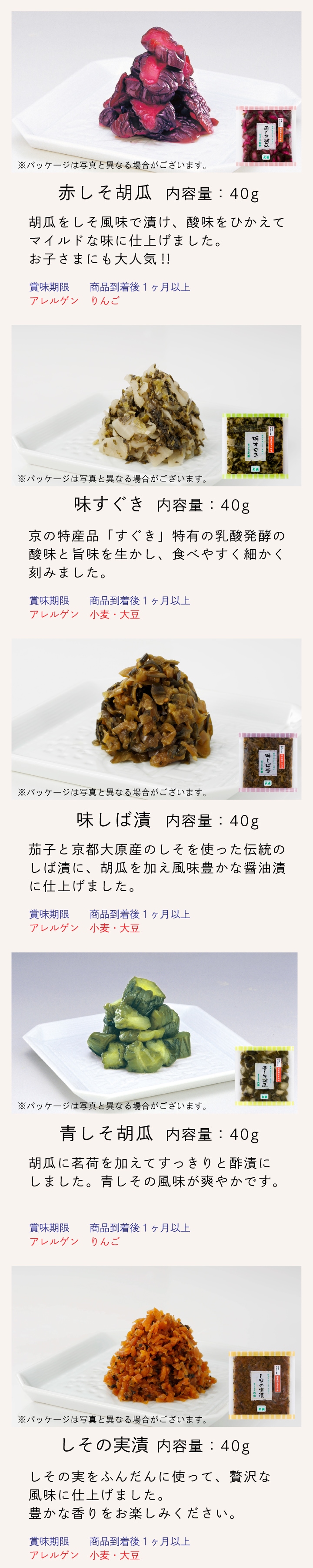| 内容量 | おみやげ袋(M-11)×5袋(青しそ胡瓜40g、赤しそ胡瓜40g、味しば漬40g、味すぐき40g、しその実漬40g) |