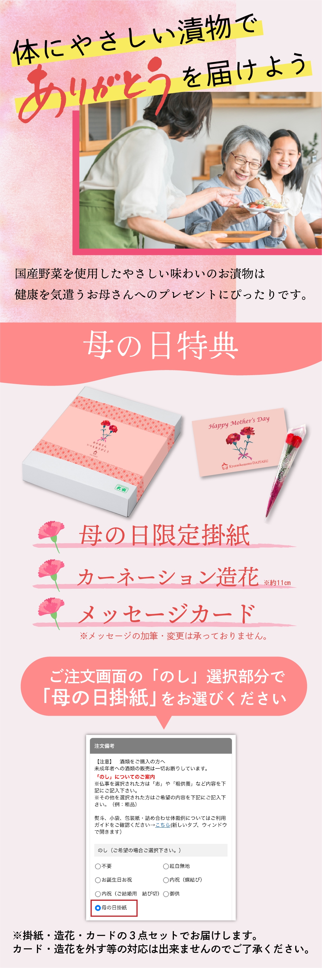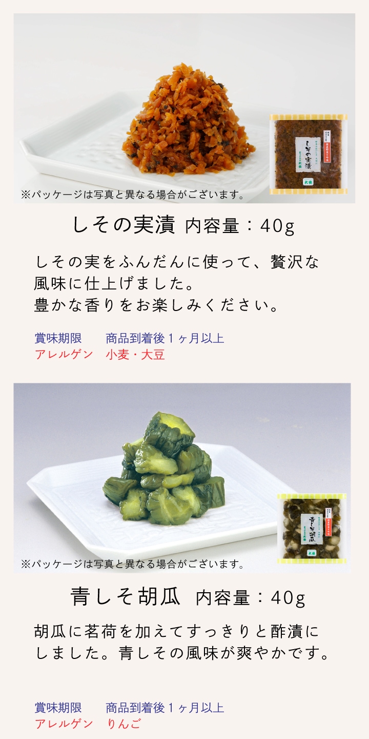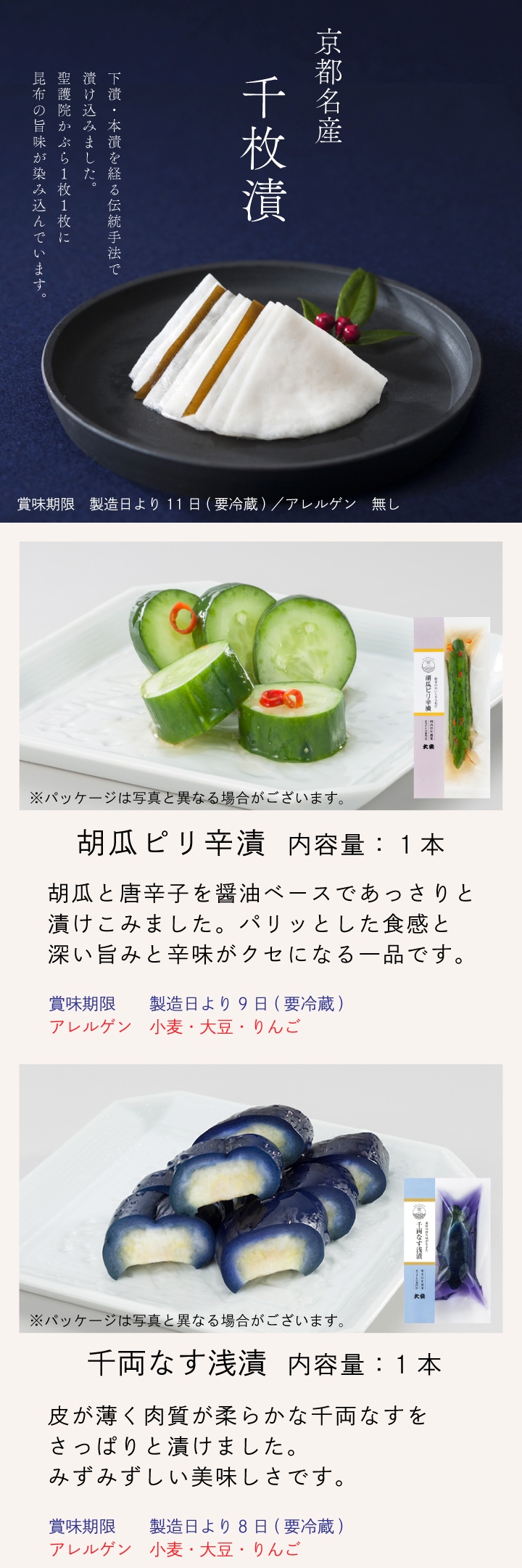| 保存方法 | <千枚漬・胡瓜ピリ辛漬・千両なす浅漬> 冷蔵10℃以下で保存 <青しそ胡瓜・味しば漬・味すぐき・しその実漬> 直射日光、高温多湿を避け保存してください |