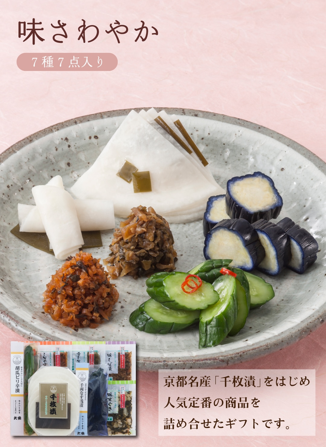 | セット内容 | 千枚漬70g、胡瓜ピリ辛漬1本、千両なす浅漬1個、青しそ胡瓜40g、味しば漬40g、味すぐき40g、しその実漬40g |