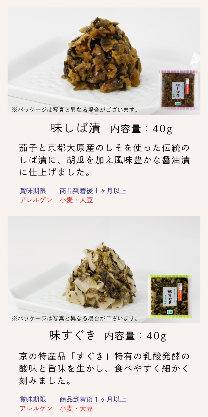 <千枚漬> 聖護院かぶら、昆布、漬け原材料[醸造酢、みりん、食塩、昆布エキス、還元水あめ、砂糖、清酒]/調味料(アミノ酸等) <胡瓜ピリ辛漬> 胡瓜、漬け原材料[還元水あめ、しょうゆ、りんご酢、砂糖、みりん、食塩、昆布エキス、唐辛子]/調味料(アミノ酸等)、(一部に小麦・大豆・りんごを含む) <千両なす浅漬> 茄子、漬け原材料[還元水あめ、食塩、しょうゆ、りんご酢、みりん、昆布エキス]/調味料(アミノ酸等)、ミョウバン、酸化防止剤(ビタミンC)、(一部に小麦・大豆・りんごを含む) <青しそ胡瓜> 胡瓜、みょうが、生姜、しそ、漬け原材料[還元水あめ、梅酢、りんご酢、醸造酢、みりん、食塩、砂糖、昆布エキス]/調味料(アミノ酸等)、(一部にりんごを含む) <味しば漬> 胡瓜、茄子、しそ、漬け原材料[しょうゆ、みりん、醸造酢、清酒、砂糖、食塩]/調味料(アミノ酸等)、(一部に小麦・大豆を含む) <味すぐき>すぐき菜、漬け原材料[清酒、食塩、醸造酢、梅酢、還元水あめ、しょうゆ、みりん、砂糖]/調味料(アミノ酸)、(一部に小麦・大豆を含む) <しその実漬> 大根、胡瓜、しそ、しその実、生姜、漬け原材料[しょうゆ、還元水あめ、醸造酢、食塩、清酒、昆布エキス、香辛料]/調味料(アミノ酸等)、紅麹色素、クチナシ色素、(一部に小麦・大豆を含む) |